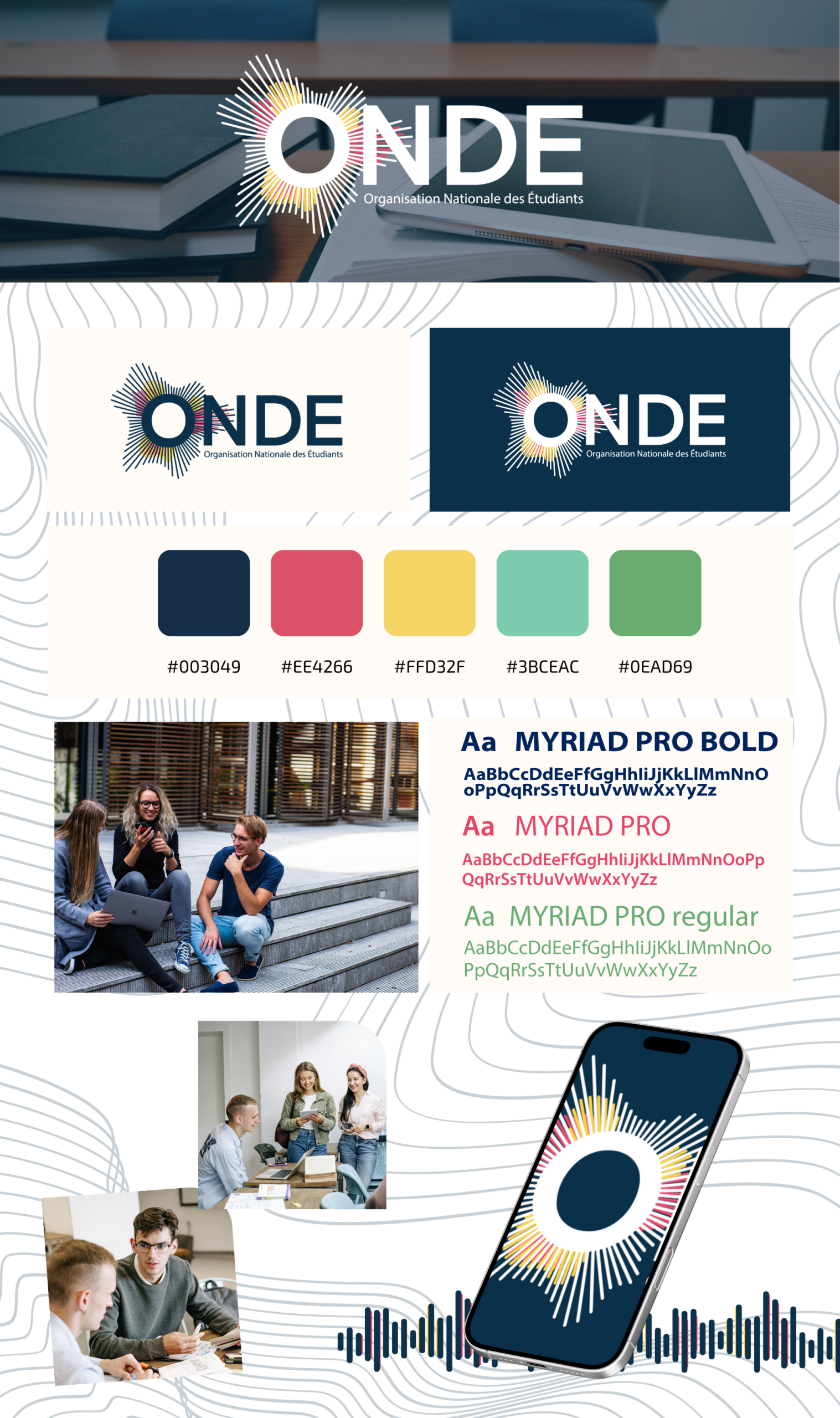 Le logo ONDE s’impose comme un symbole fédérateur, à la fois lisible et porteur de sens. Le « O » rayonnant évoque le déploiement territorial de l’organisation et son ambition de faire circuler les initiatives étudiantes à l’échelle nationale. Ce choix graphique traduit une dynamique collective et un engagement qui se diffuse, de structure en structure.
